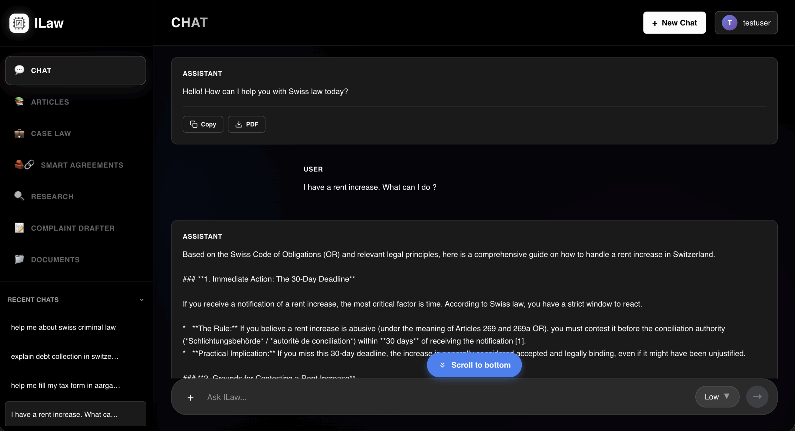 Ask ILaw about Swiss law, legal procedures, or case specifics and receive instant, accurate, and well-referenced responses. The AI chat combines legal knowledge with natural language understanding to make research and drafting simpler, faster, and smarter.