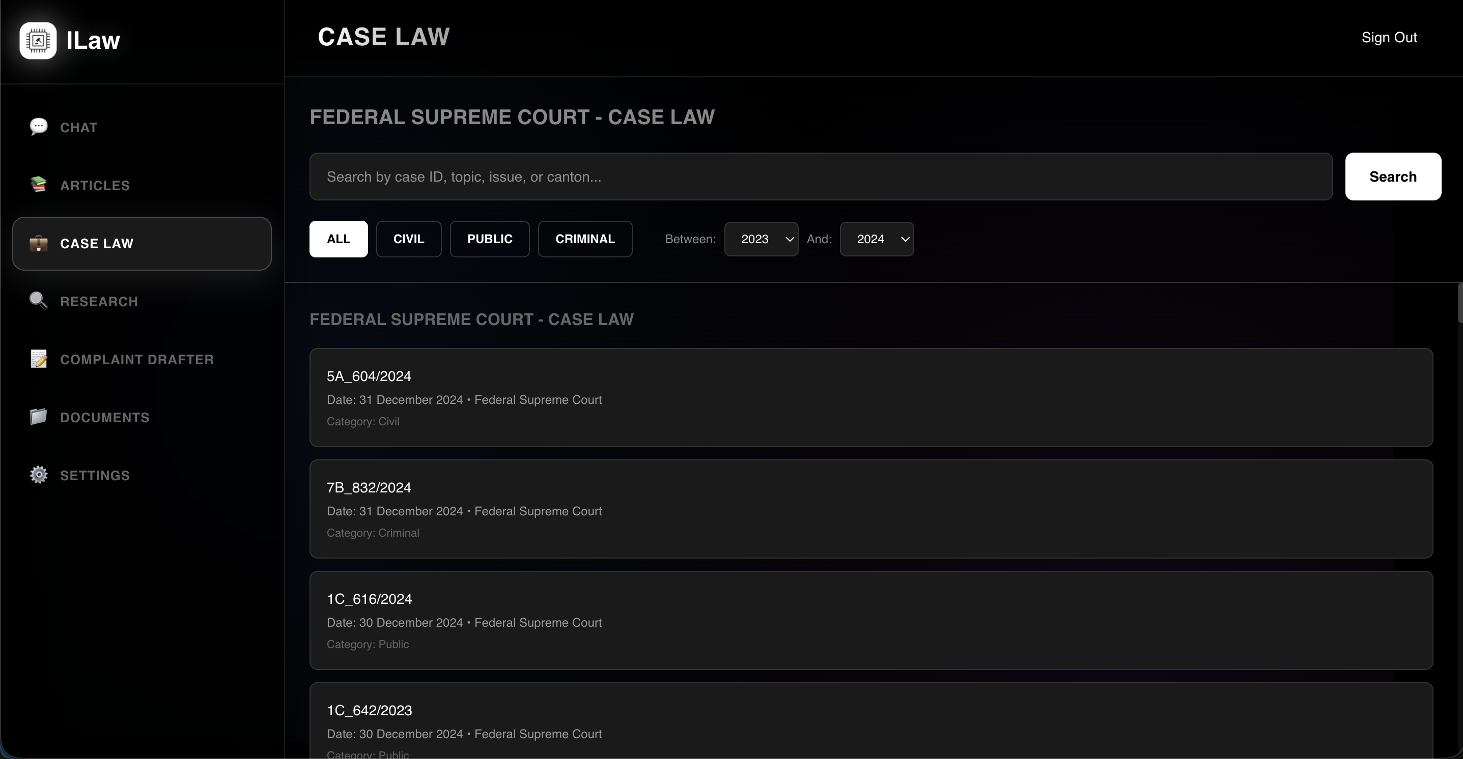 The Case Law module allows you to browse through judgments and legal rulings from Swiss courts, filtered by topic, jurisdiction, or keywords. ILaw provides context-aware summaries and insights so you can focus on strategy, not search.