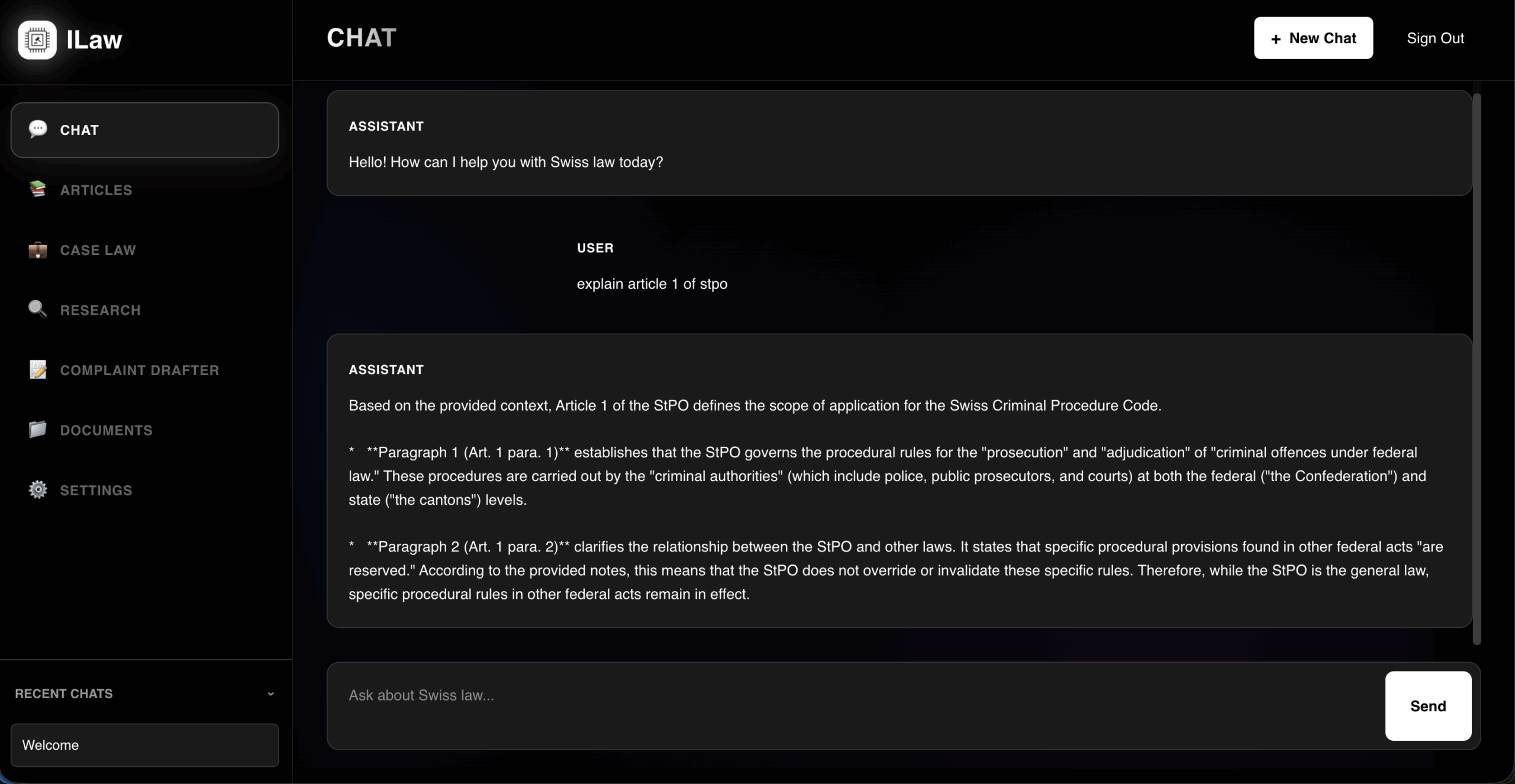 Ask ILaw about Swiss law, legal procedures, or case specifics and receive instant, accurate, and well-referenced responses. The AI chat combines legal knowledge with natural language understanding to make research and drafting simpler, faster, and smarter.